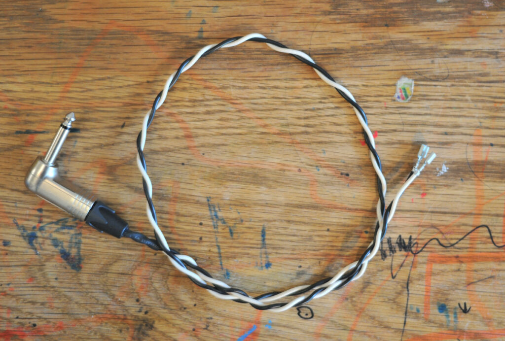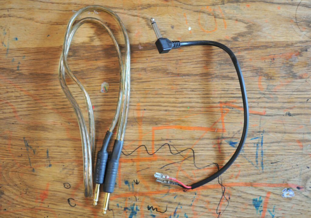 左側はヘッドとキャビを接続するためのフォン-フォンのケーブル。右側はキャビネット内部で使われているフォン-ファストン端子のケーブルです。