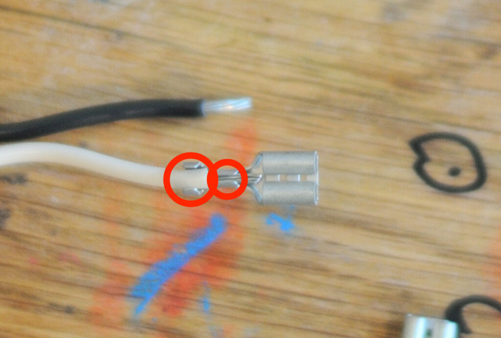 圧着するのは、以下写真の丸で囲った2箇所。導線部分と被膜部分それぞれを圧着します。