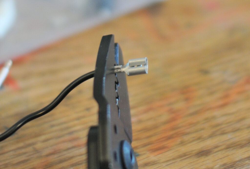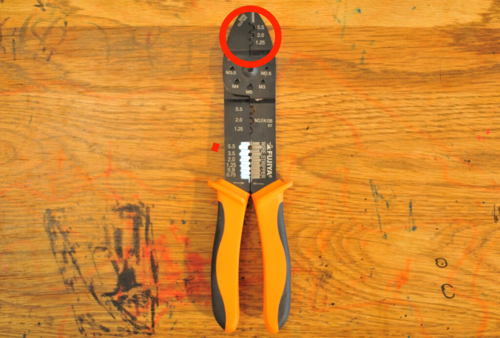 圧着に使う工具はこんなモノ。丸でかこった部分を使ってファストン端子を圧着します。