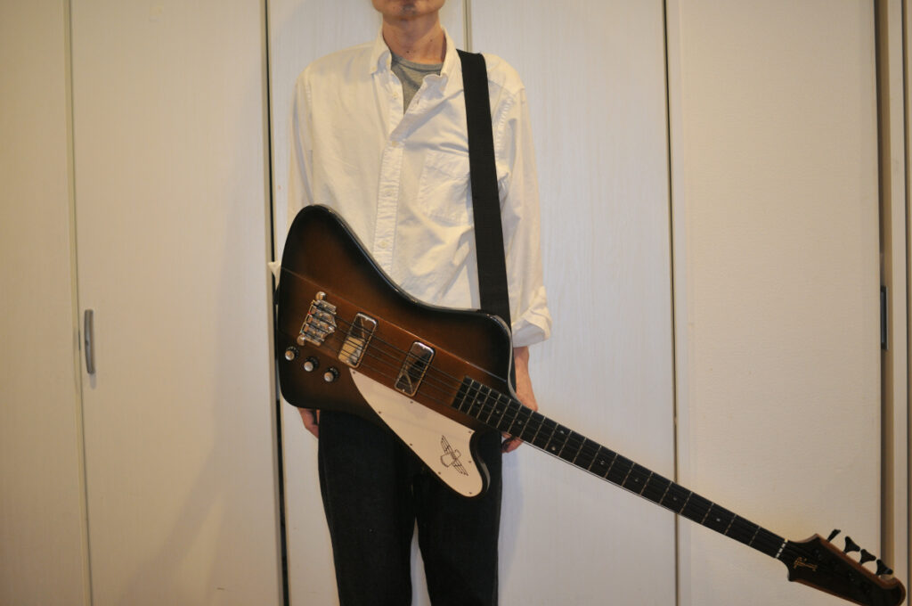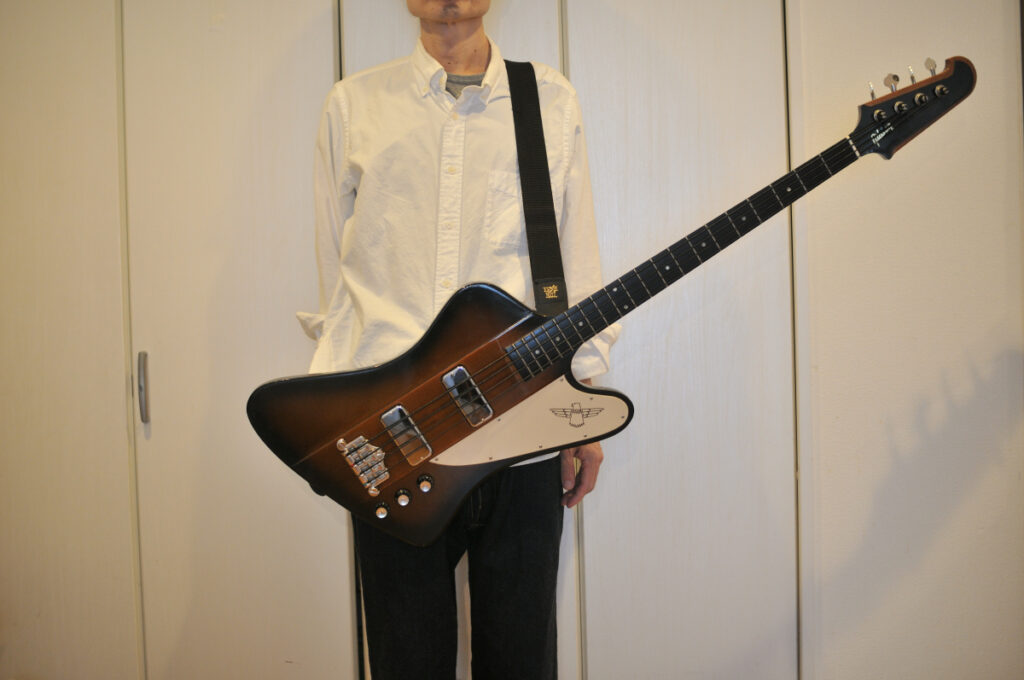 見事にヘッド落ちしております。これはギブソンサンダーバードの宿命。ちなみにストラップはアーニーボールのナイロン製です。