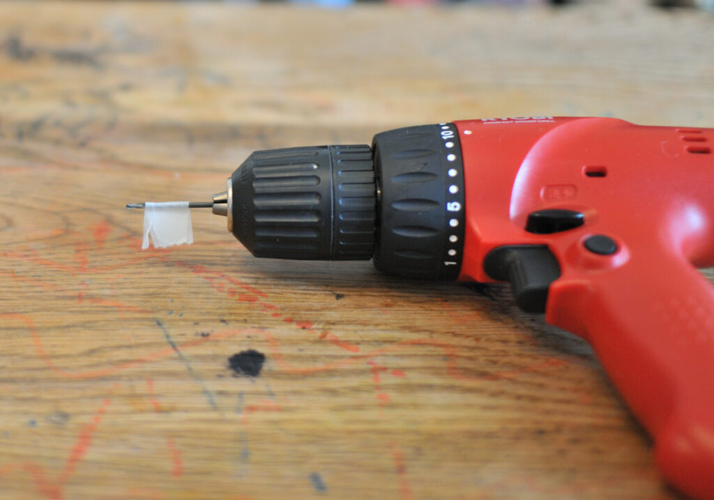ドリルのビットにマスキングテープが付いているのは、穴が深くなりすぎないための一工夫。これも結構重要です。